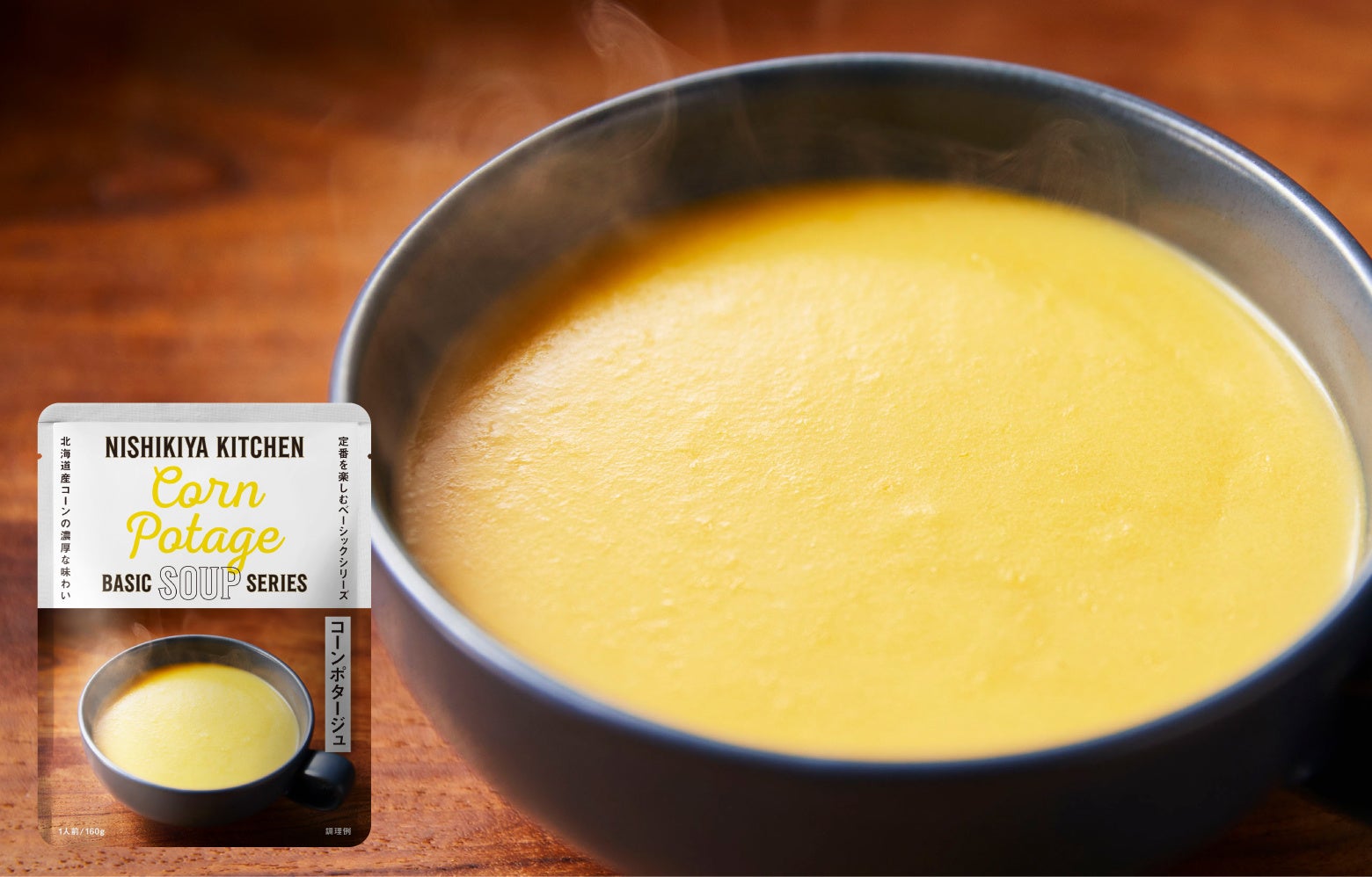 コーンの素材のおいしさを最大限に生かすために、小麦粉、クリーム、バターは使用していません。上品で口当たりのよい、素材そのものの甘みをお楽しみいただけます。ニシキヤキッチンの商品の中でリピート率No.1の濃厚ポタージュです。