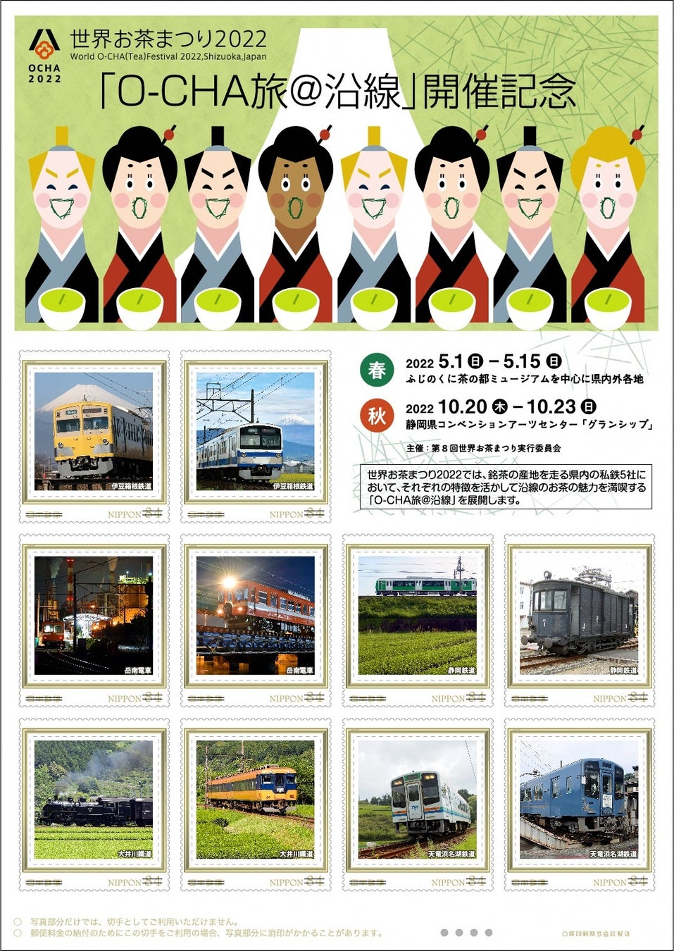 プログラムの1つである「O-CHA旅@沿線」の開催を記念し、静岡県内私鉄5社の車両の写真を配したオリジナルフレーム切手を3月16日(水)より静岡県内全郵便局483局(一部の簡易郵便局は除きます)及び第8回世界お茶まつり実行委員会事務局にて販売を開始しました。