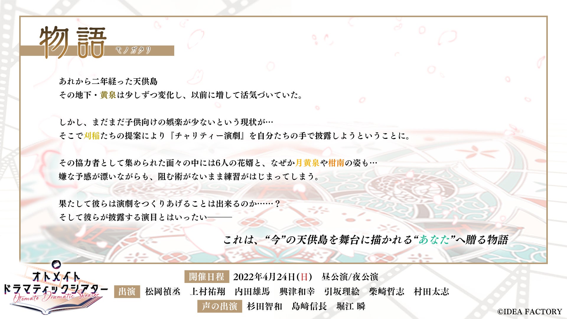 アイディアファクトリー株式会社の女性向けゲームブランド「オトメイト」は、2022年4月24日(日)開催予定『オトメイトドラマティックシアター オランピアソワレ ~Un Cadeau pour toi~』の《一般先行抽選 1次プレリザーブ》申込開始をお知らせいたします。またイベント内の朗読劇あらすじを公開いたしました。
