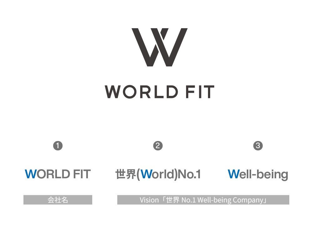社名“WORLD FIT”の「W」、ビジョンに掲げる“世界(World)No.1”の「W」、そして“Well-being”の「W」。