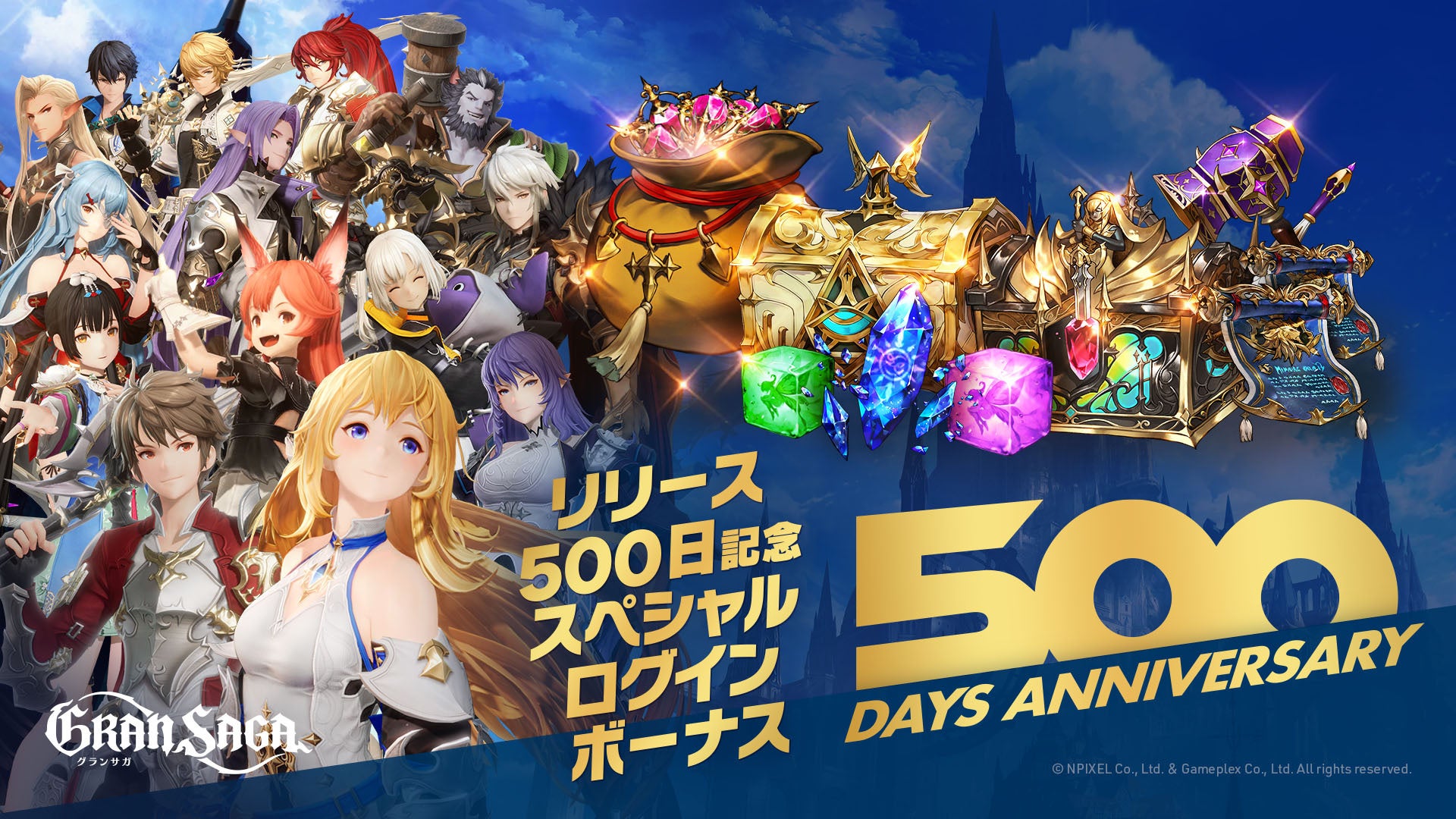 本日実施しましたアップデートより、グランサガをプレイしてくださっている皆様への感謝を込めた「リリース500日記念スペシャルログインボーナス」を開催いたします!