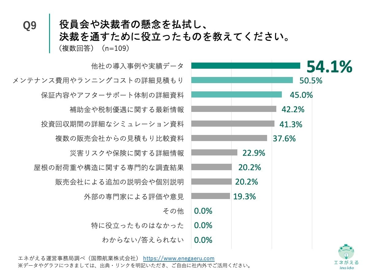 「Q9. Q8で「特にない」「わからない/答えられない」以外を回答した方にお聞きします。役員会や決裁者の懸念を払拭し、決裁を通すために役立ったものを教えてください。(複数回答)」(n=109)と質問したところ、「他社の導入事例や実績データ」が54.1%、「メンテナンス費用やランニングコストの詳細見積もり」が50.5%、「保証内容やアフターサポート体制の詳細資料」が45.0%という回答になりました。