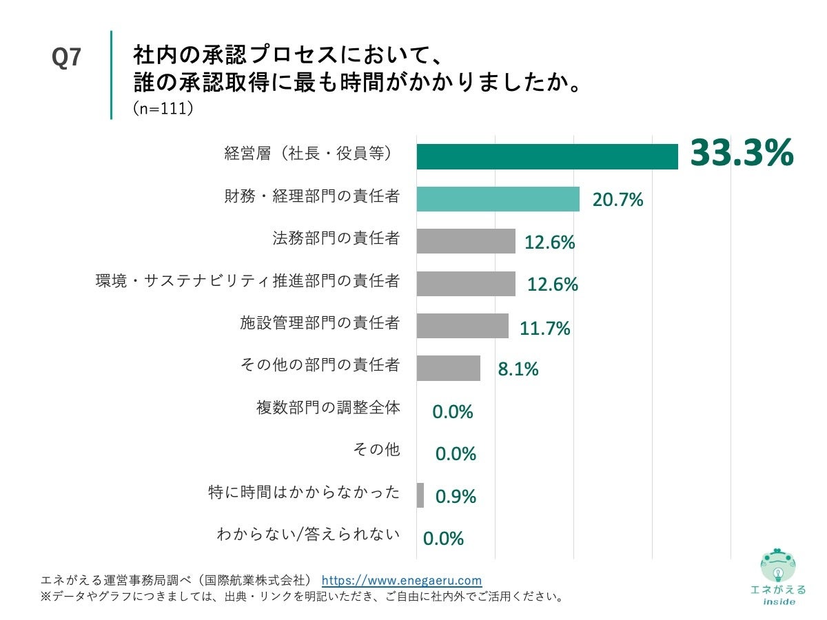 「Q7. 社内の承認プロセスにおいて、誰の承認取得に最も時間がかかりましたか。」(n=111)と質問したところ、「経営層(社長・役員等)」が33.3%、「財務・経理部門の責任者」が20.7%という回答になりました。