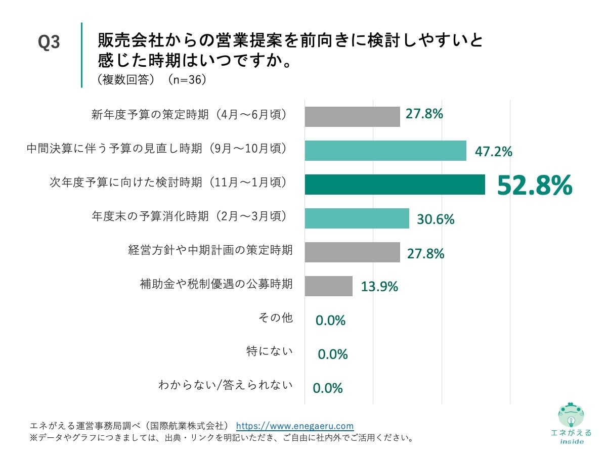 「Q3. Q2で「販売会社からの営業提案を受け、その後に社内検討を進めた」「自社での検討と、販売会社からの提案がほぼ同じ時期に進んだ」と回答した方にお聞きします。販売会社からの営業提案を前向きに検討しやすいと感じた時期はいつですか。(複数回答)」(n=36)と質問したところ、「次年度予算に向けた検討時期(11月~1月頃)」が52.8%、「中間決算に伴う予算の見直し時期(9月~10月頃)」が47.2%、「年度末の予算消化時期(2月~3月頃)」が30.6%という回答になりました。