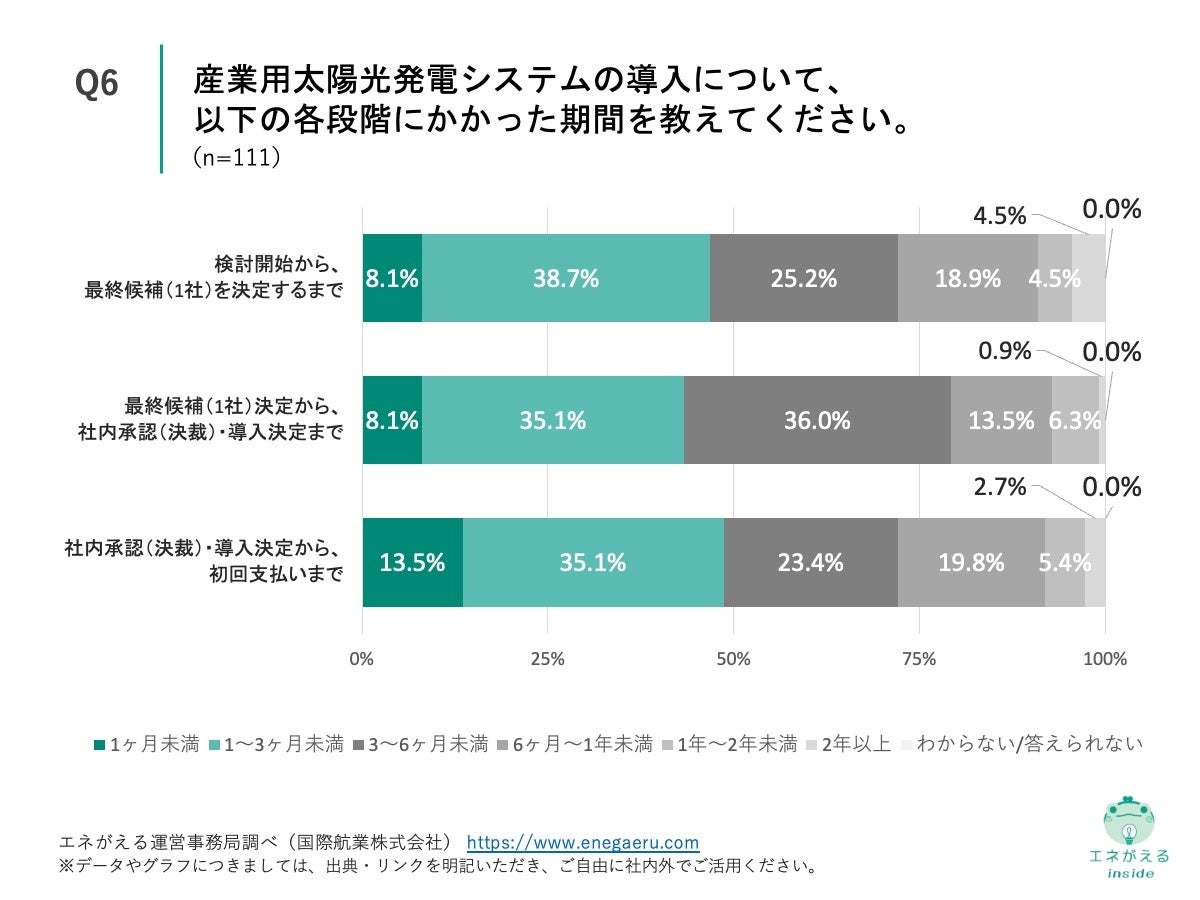 「Q6. 産業用太陽光発電システムの導入について、以下の各段階にかかった期間を教えてください。※「検討開始」は、社内で導入に向けた検討が正式に始まった時点を指します。 ※「導入決定」は、社内の決裁が完了し、導入実施が正式に決まった時点を指します。 ※「初回支払い」は、契約に基づく最初の支払い(着手金・初回請求等)を指します。」(n=111)と質問したところ、検討開始から、最終候補(1社)を決定するまでは「1~3ヶ月未満」が38.7%、最終候補(1社)決定から、社内承認(決裁)・導入決定までは「3~6ヶ月未満」が36.0%、社内承認(決裁)・導入決定から、初回支払いまでは「1~3ヶ月未満」が35.1%という回答となりました。