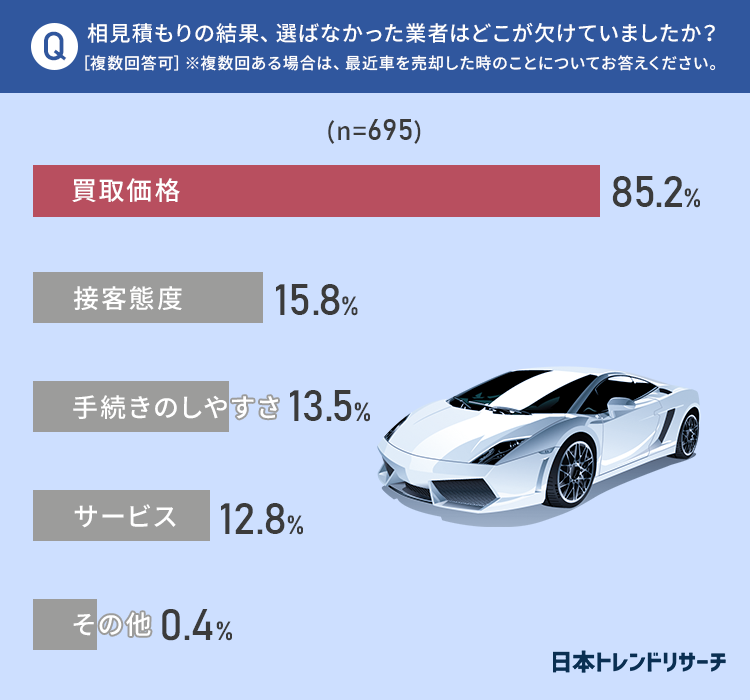また、52.5%の方が売却の際に相見積もりを取っており、そのうち85.2%の方が「買取価格を理由に選ばなかった業者がある」と回答しました。