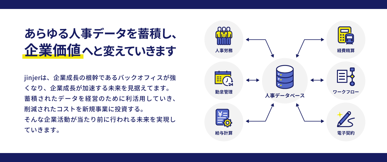 「ジンジャー」は、人事労務・勤怠管理・給与計算・ワークフロー・経費精算・電子契約など、バックオフィス業務の効率化を支援するクラウドサービスです。バックオフィスに関わるデータを「ジンジャー」に集約し、「1つのデータベース」で管理することで、各サービスにおける情報登録や変更の手間を削減します。