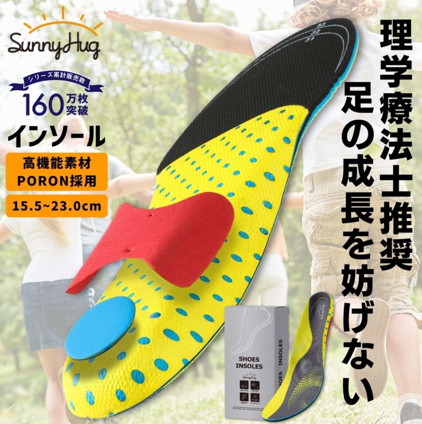 現役理学療法士が監修したSunnyHug(サニーハグ)の子供用インソールは、「履くだけで正しいアーチ形成をサポート」し、成長期の扁平足・X脚・O脚対策に最適なアイテムです。土踏まず・ヒールカップ・中足骨パッドの「3点アーチ構造」が、子供の柔らかい骨格を正しい位置へ導き、美しい姿勢と疲れにくい足づくりをサポートします。さらに、かかと部分には高機能ウレタン素材「PORON(ポロン)」を採用。一般的な中敷きに使われているウレタンとは異なり、優れた衝撃吸収性と耐久性でへたりにくく、疲労軽減をサポートします。本製品はハサミでカットしてサイズ調整が可能ですが、矯正効果を高めるためにしっかりとした厚みを持たせているため、甲の低い上履きなどではなく、調整可能なスニーカーでのご使用を推奨します。