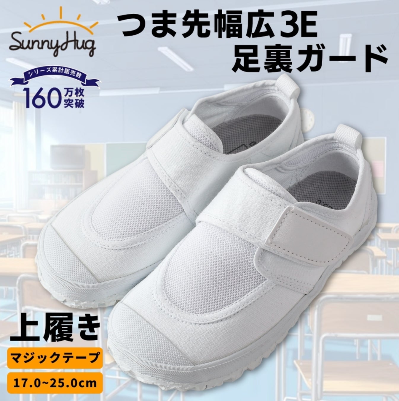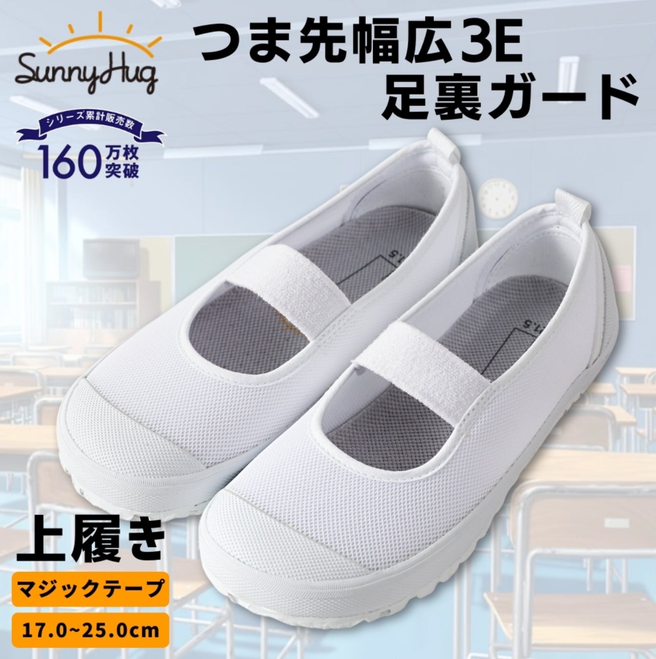 SunnyHugの上履きは幅広・甲高設計でお子様の足の成長を妨げません。また、マジックテープで調整可能なのでどなたでもフィットしやすい仕様です。ソール・インソールはクッション性に優れ、疲れにくいため、健やかな成長をサポートします。甲部分、インソールは立体メッシュ構造になっており、蒸れにくく快適な着用感が続きます。底面はグリップ性に優れていますので、体育館シューズとしても最適です。またSunnyHugの上履き・上靴は25cmまで展開しており女性でもナースシューズとして看護、介護シーン等でも最適です。体育館シューズとしても使える丈夫な設計です。