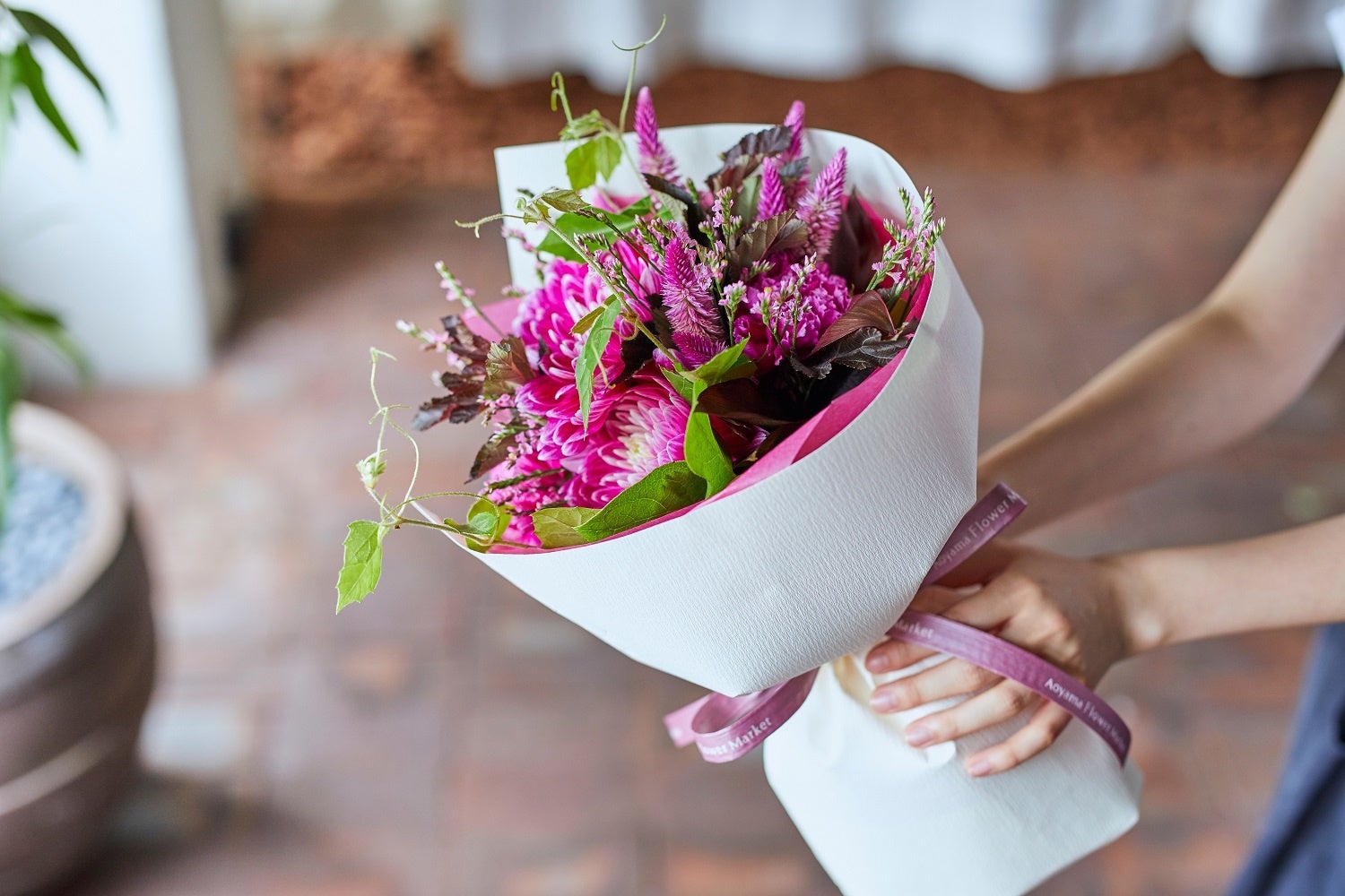 青山フラワーマーケットは「Living With Flowers Every Day」をコンセプトに、花や緑に囲まれた心ゆたかなライフスタイルをご提案するフラワーショップです。パリのマルシェをイメージした店内には、季節の花が満開。日常になじむデザインと使い心地にこだわって開発したフラワーベースや、花ばさみをはじめとするケアグッズなど、花をお楽しみいただくためのオリジナルアイテムも多数取り揃えています。