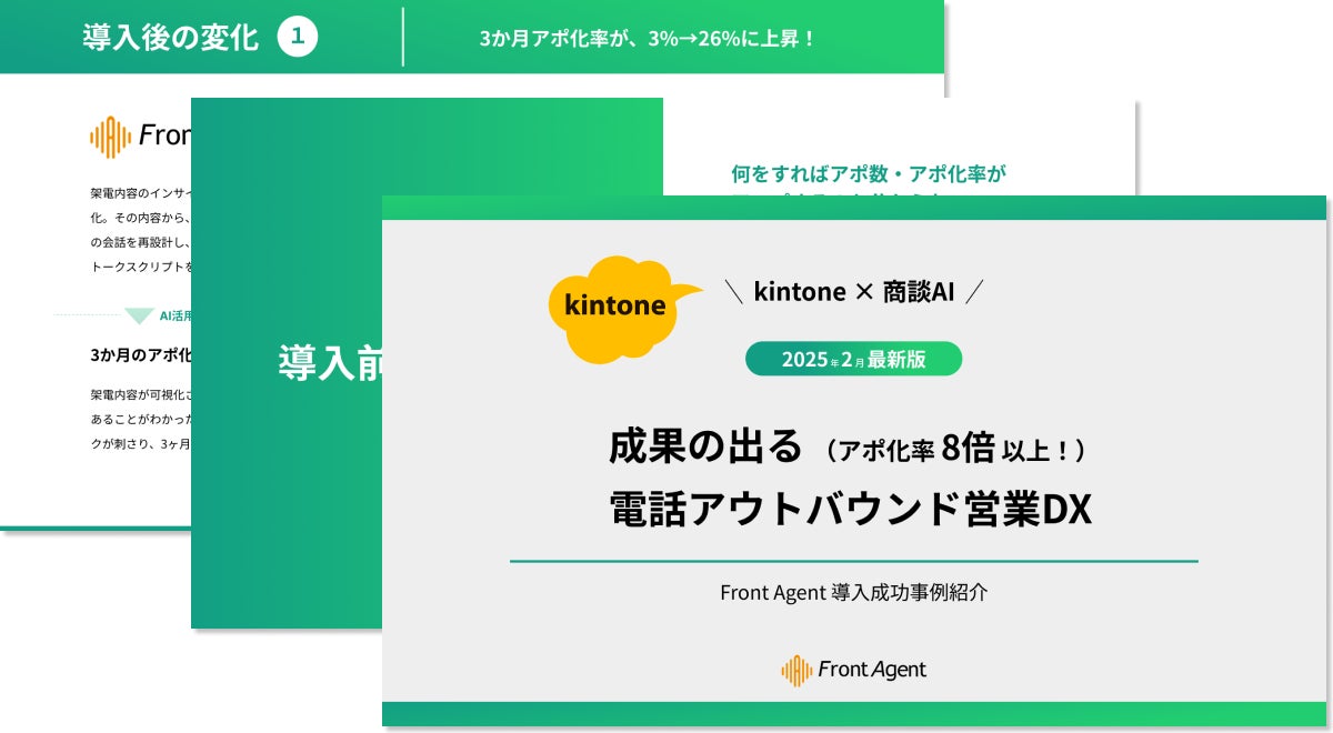 本資料では、商談AI 「Front Agent」とノーコードCRM「kintone」を連携させることで、アポ化率を8倍以上上げることを成功させた、アウトバウンドコールサービス事業者の事例をご紹介します。