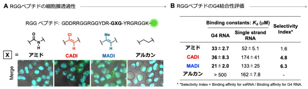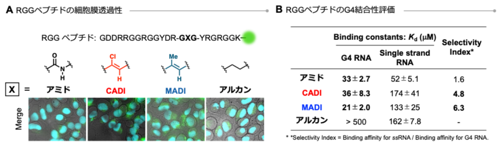 最後に、21残基からなるアルギニン-グリシン-グリシン (RGG) ペプチドへと応用し、膜透過性の向上と核酸 (グアニン四重鎖; G4) への結合能の維持が両立できるかを検証しました (図4)。CADIおよびメチルアルケンジペプチドイソスター (MADI) を導入することで、細胞膜透過性を大幅に向上させながら、天然型と同等のG4結合親和性を維持し、さらにG4選択性を向上させることに成功しました。一方で、疎水性は高いものの、構造的に柔軟なアルカン型ではG4結合親和性および選択性が著しく低下しました。この結果から、ADIの「適度な疎水性」と「構造の剛直性」が、膜透過性と機能性を同時に両立させる鍵であることが示されました。