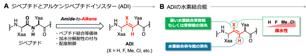 アルケンジペプチドイソスター (ADI) は、ペプチド結合を結合長と結合角がよく似た炭素–炭素二重結合に置換した構造的に類似したバイオイソスターです。これまでの研究から、ペプチドにADIを導入すると、酵素による分解を受けにくくなるだけでなく、ペプチドの形(立体構造)を整えることが可能であることが報告されてきました。本研究では、これまで十分に調べられてこなかったADIの「水素結合の性質」に着目し、それが膜透過性にどのような影響を与えるのかを検証しました (図1)。