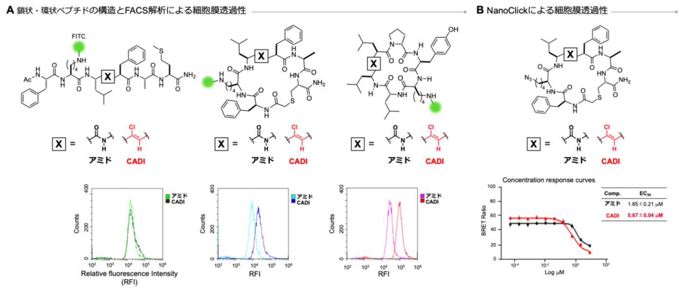 ■ ペプチドにCADIを導入することで、膜透過性が大幅に向上する分子設計技術を開発