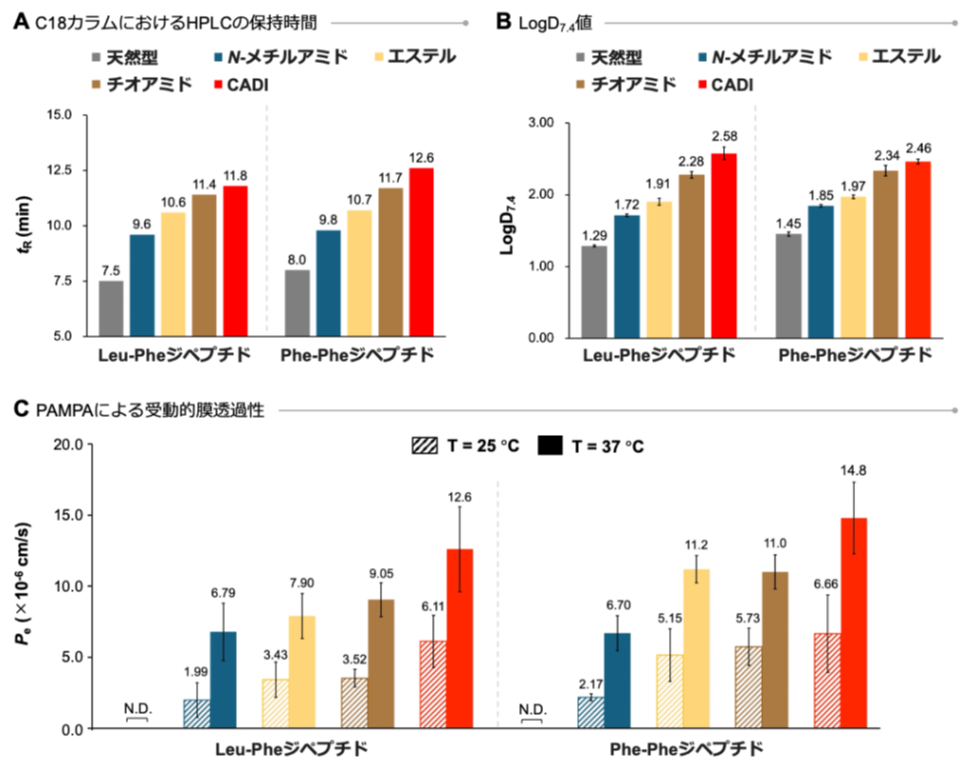 まず、アミノ酸2残基のジペプチドモデルを用いて、これまでにペプチドの膜透過性を向上させる骨格として活用されてきたN-メチルアミド、エステル、チオアミドとCADIの物性を比較しました。具体的には、高速液体クロマトグラフィー (HPLC) によるC18カラムにおける保持時間測定、LogD7.4値の算出および人工膜透過性評価 (PAMPA) (注6) を行いました (図2)。その結果、CADI型は最も高い疎水性を示し、いずれのジペプチドにおいても最も高い受動的膜透過性を示しました。さらに分子動力学計算の結果、CADI骨格周囲では水素結合ネットワークが顕著に弱まっており、この高い疎水性が「脱水和」を促進することで膜透過のエネルギー障壁を下げていることが示唆されました。