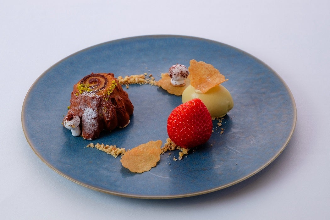 かわいらしい切り株の形をしたクリスマスケーキ「ブッシュ・ド・ノエル」に添えたのは、自家製ピスタチオのアイスクリームと福岡県の大石農園で端正こめて育てられたあまおう苺。あまおうは特に大粒のものをキルシュに漬け込み、少し大人の風味をプラス。苺の甘みと酸味、ピスタチオやナッツの歯ざわり、チョコレートのなめらかな口溶けなど、五感で楽しめる一皿です。