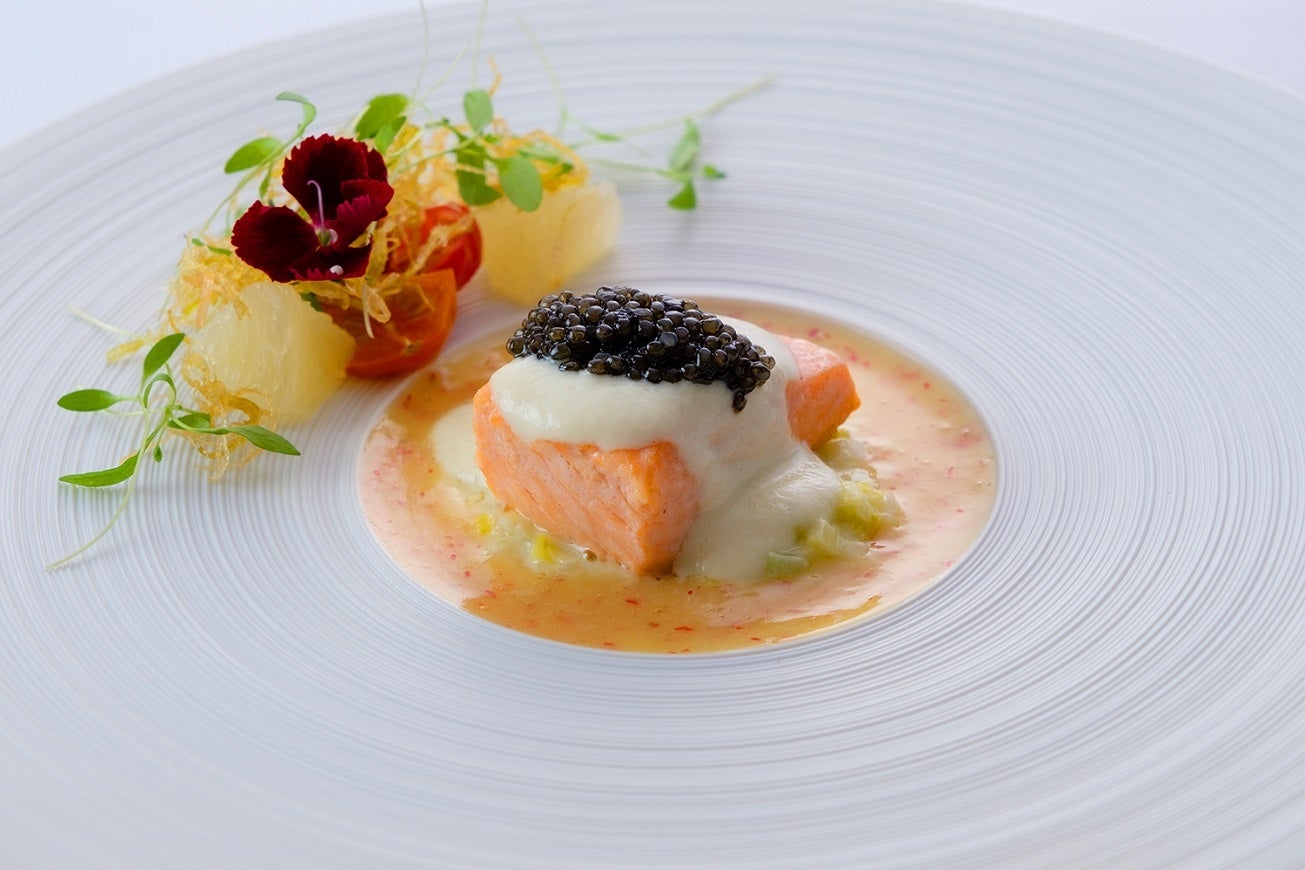 玄界灘で育った身のしまったサーモンを絶妙な火入れでしっとりと仕上げました。シャンパンを使った爽やかな⽢さのあるソースは、ピンクペッパーがアクセントに。ポロ葱の甘みを存分に引き出したア・ラ・クレーム(調理した材料の煮汁などにクリームを加え、ソースにする料理)とキャビアで特別感を。