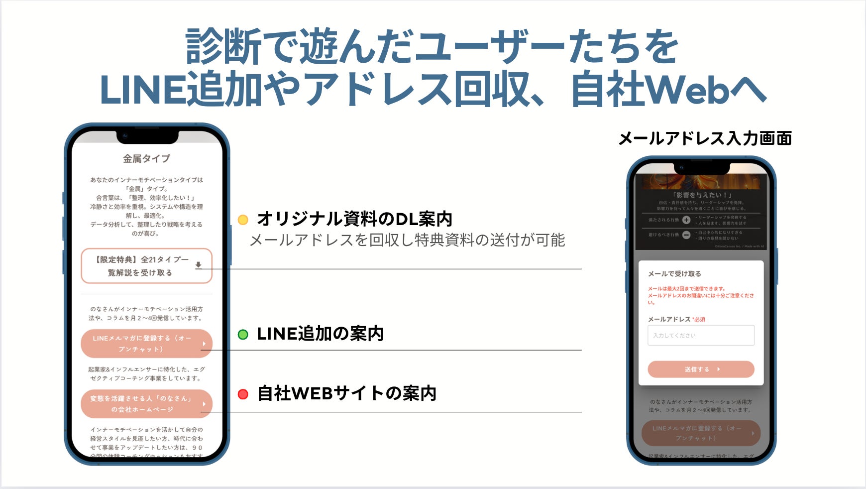 また、メール以外にも、LINE、Webサイト、体験セッションの申し込みフォームなど、さまざまなチャネルに誘導しています。
