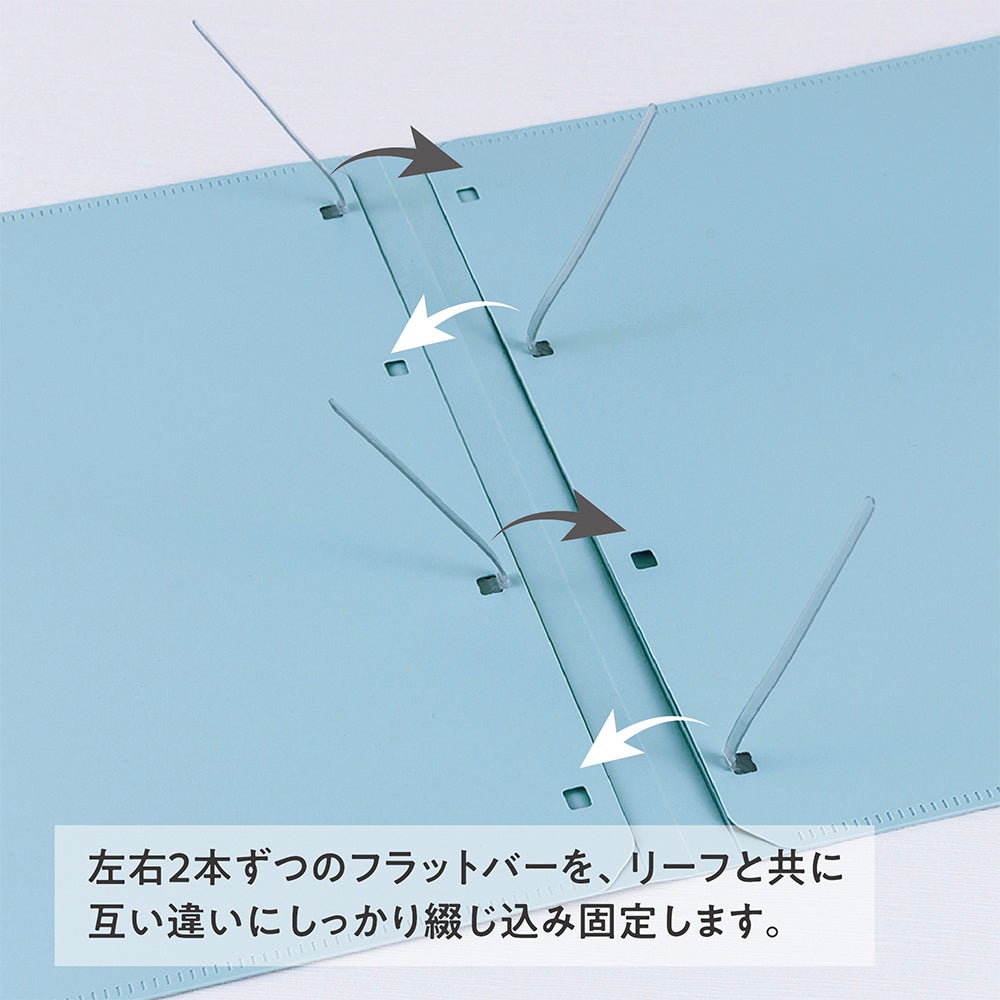 独自開発の超薄型綴具「フラットバー」を採用し、筆記時に手に当たっても気にならない薄さを実現しました。さらに、左右2本ずつ計4本のフラットバーを互い違いにしっかりと綴じ込み固定するため、安定した筆記が可能です。