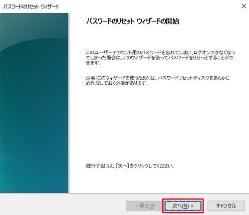Step3:「パスワードのリセットウィザード」画面が表示されたら「次へ」をクリックし、パスワードリセットディスクを挿入したドライブ名を選択します。