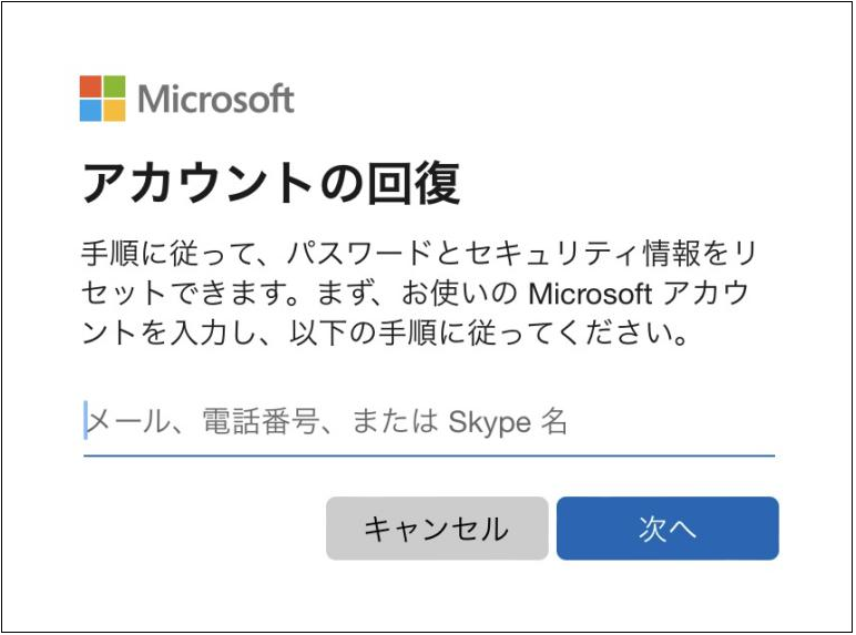 Step1:別のPCなどでMicrosoft社のアカウント回復用のページ(https://account.live.com/password/reset)にアクセスし、メールアドレスや電話番号などを入力して、「次へ」をクリックします。