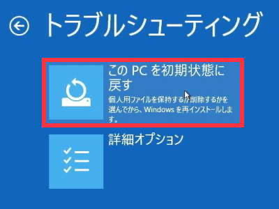 Step2:「トラブルシューティング」>「このPCを初期状態に戻す」の順にクリックします。