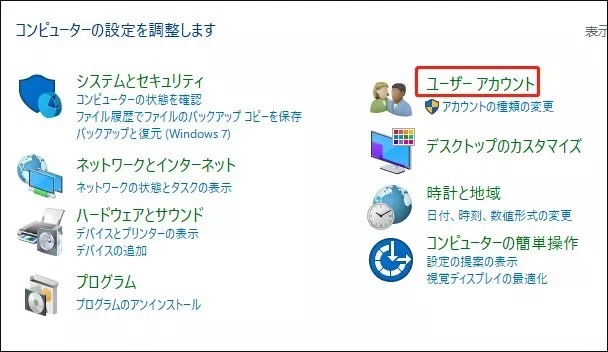 Step2:「ユーザーアカウント」の「アカウントの種類の変更」をクリックし、パスワードを忘れたアカウントを選択します。