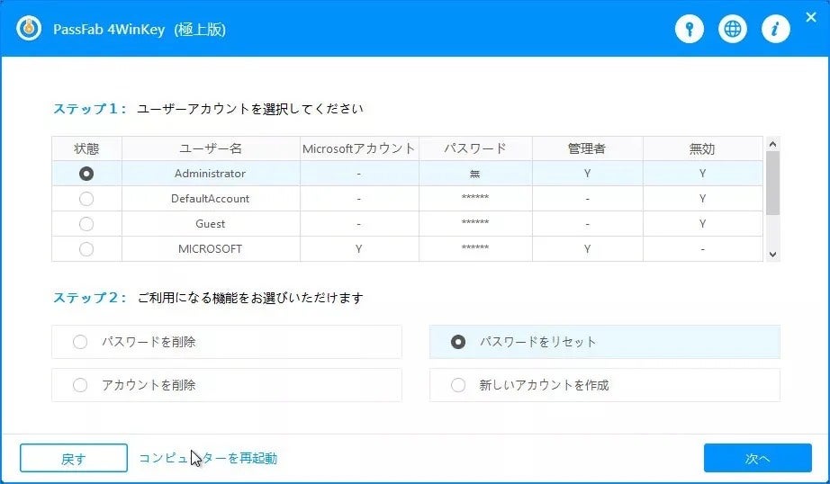 Step6:パスワードを変更したいアカウントと「パスワードをリセット」を選択して、「次へ」をクリックし、新しいパスワードを設定します。設定後、PCを再起動すると、新しく設定したパスワードでログインできるようになります。