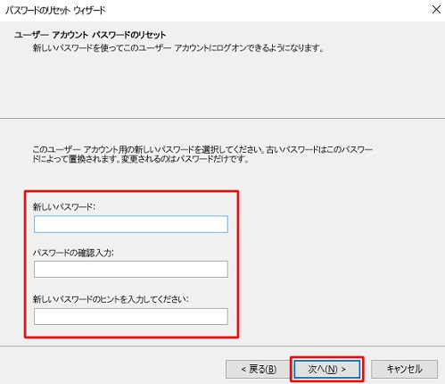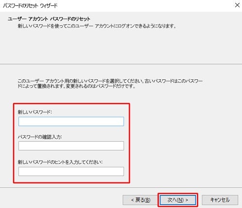 Step4:パスワードのリセット画面で、新しいパスワードとパスワードのヒントを入力して、「次へ」をクリックして完了です。