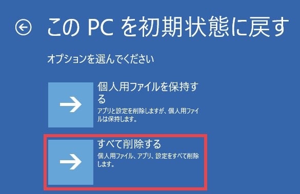Step3:「すべて削除する」を選択後、画面の指示に従って操作するとパソコンを初期化して、パスワードをリセットできます。