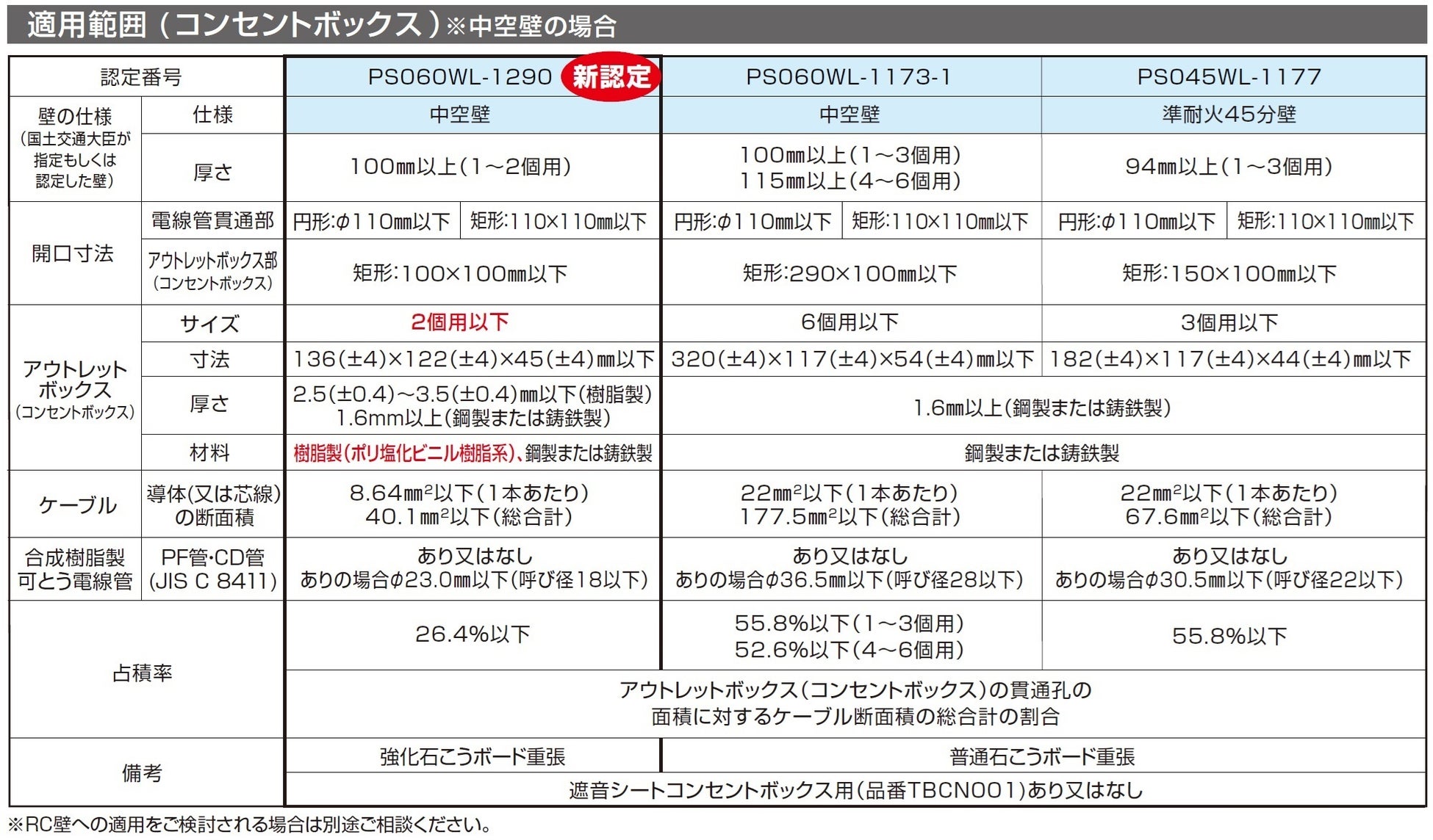 ※1 樹脂製コンセントボックス側に耐火処理が不要な認定工法として