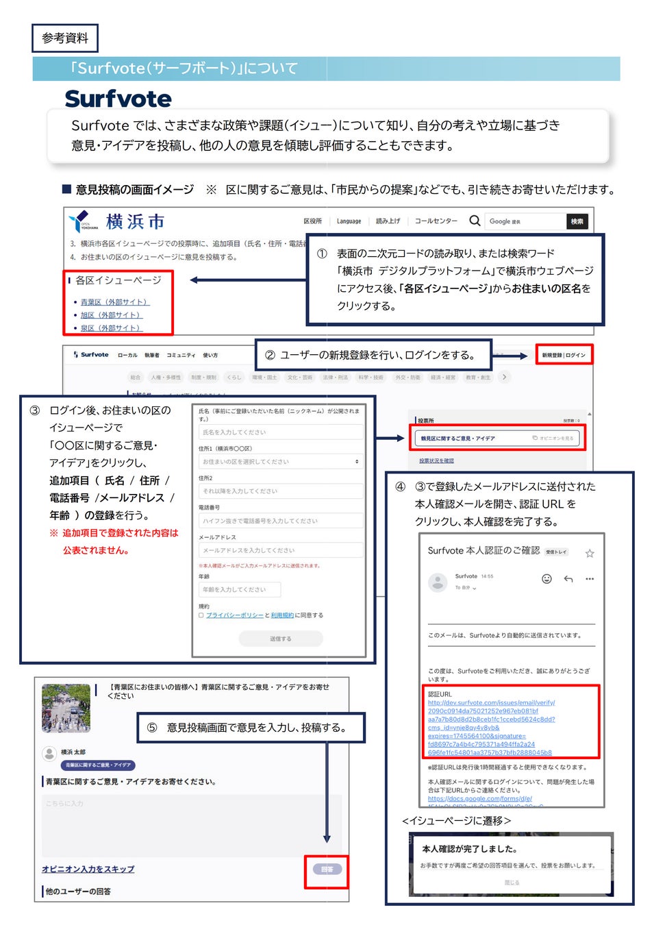 横浜市各区における地域のニーズや課題等を把握し、横浜市における施策の参考にするため、デジタルプラットフォーム「Surfvote(サーフボート)」を活用し、全市民を対象とした意見募集を実施します。