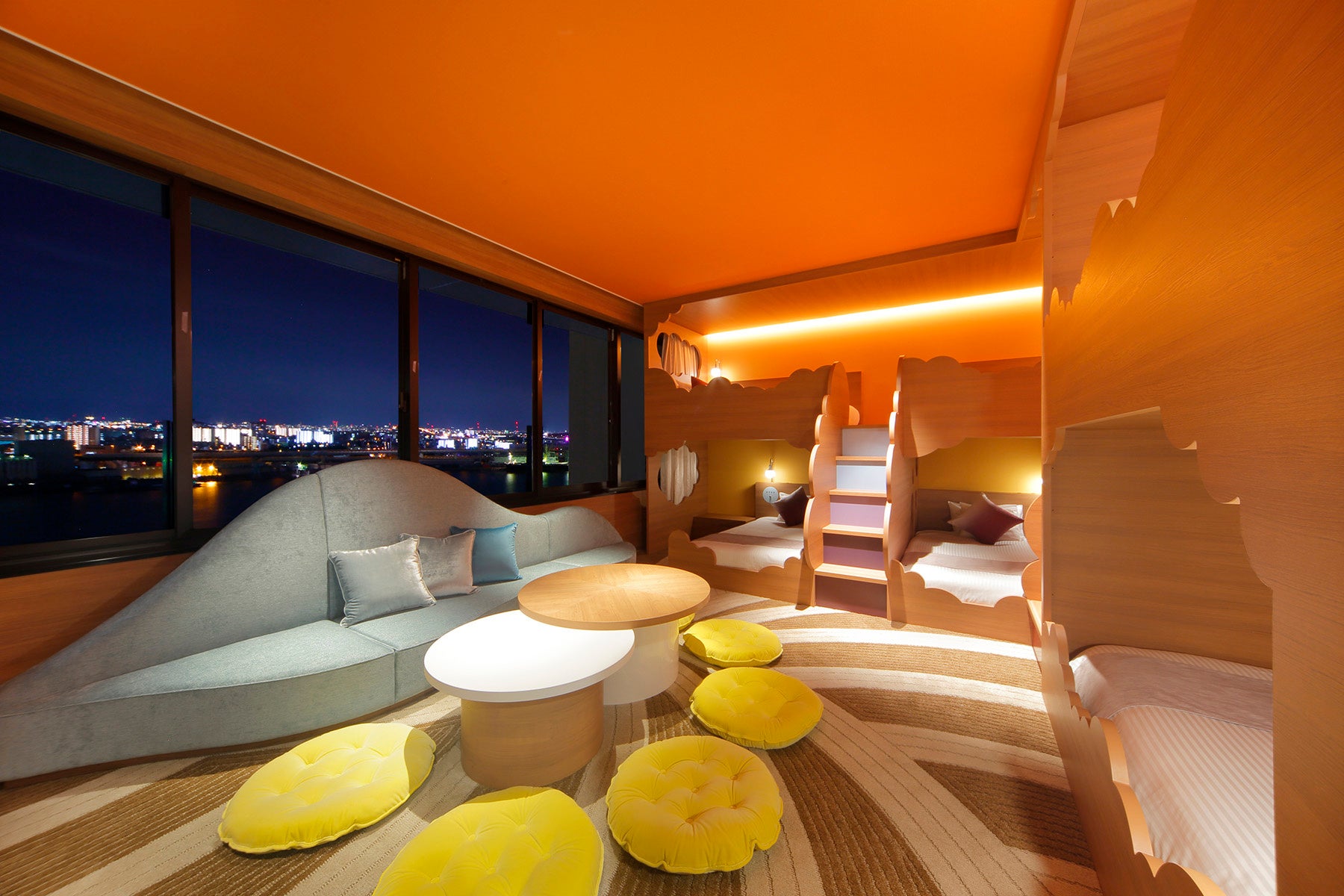 客室はパークを一望できる「スパークルーム」、上階がリビングエリア、下階がベッドルームとなった、自宅のように寛げる「もこもこメゾネットルーム」、2 段ベッドを 3 台設置した最大 6 名で宿泊できる「レインボールーム」など、個性あふれる 14 種類のゲストルームを備えています。エントランスやロビーには、ユニバーサル・スタジオ・ジャパン「ミニオン・パーク」のミニオンたちとコラボレーションした装飾(期間:2024年 7 月 14 日(日)まで予定)を施し、訪れるお客さまを楽しくお出迎えしています。