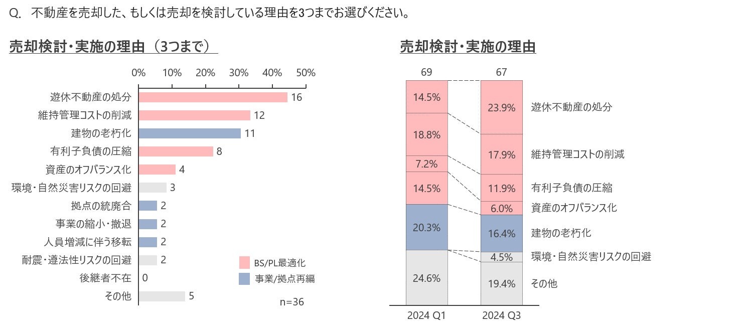 老朽化対策や不動産コスト削減が企業の不動産課題となっていることもあり、 不動産売却理由においても「遊休不動産の処分」、「維持管理コストの削減」、「建物の老朽化」が上位を占めた。