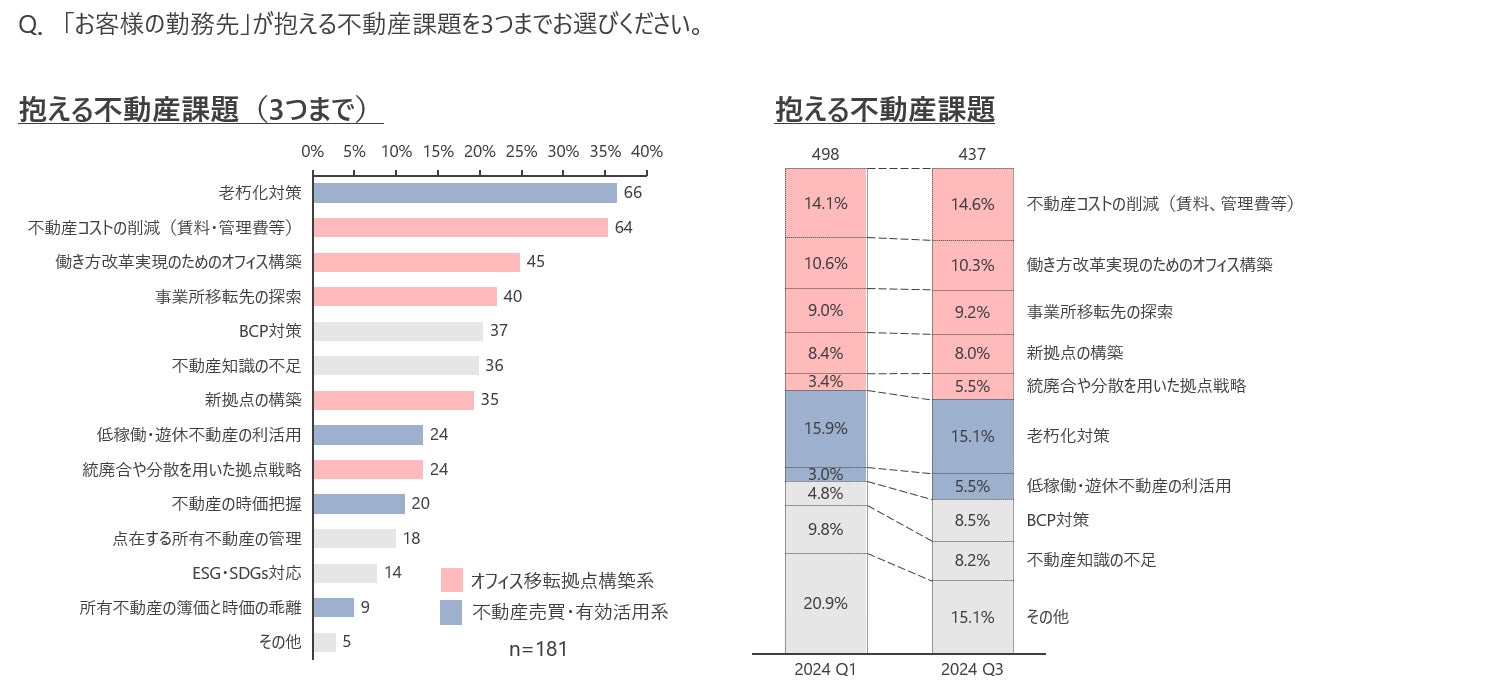 企業が抱える不動産課題について、「老朽化対策」が最も多く、「不動産コストの削減」が続く結果となり、前回から大きな変化は見られなかった。