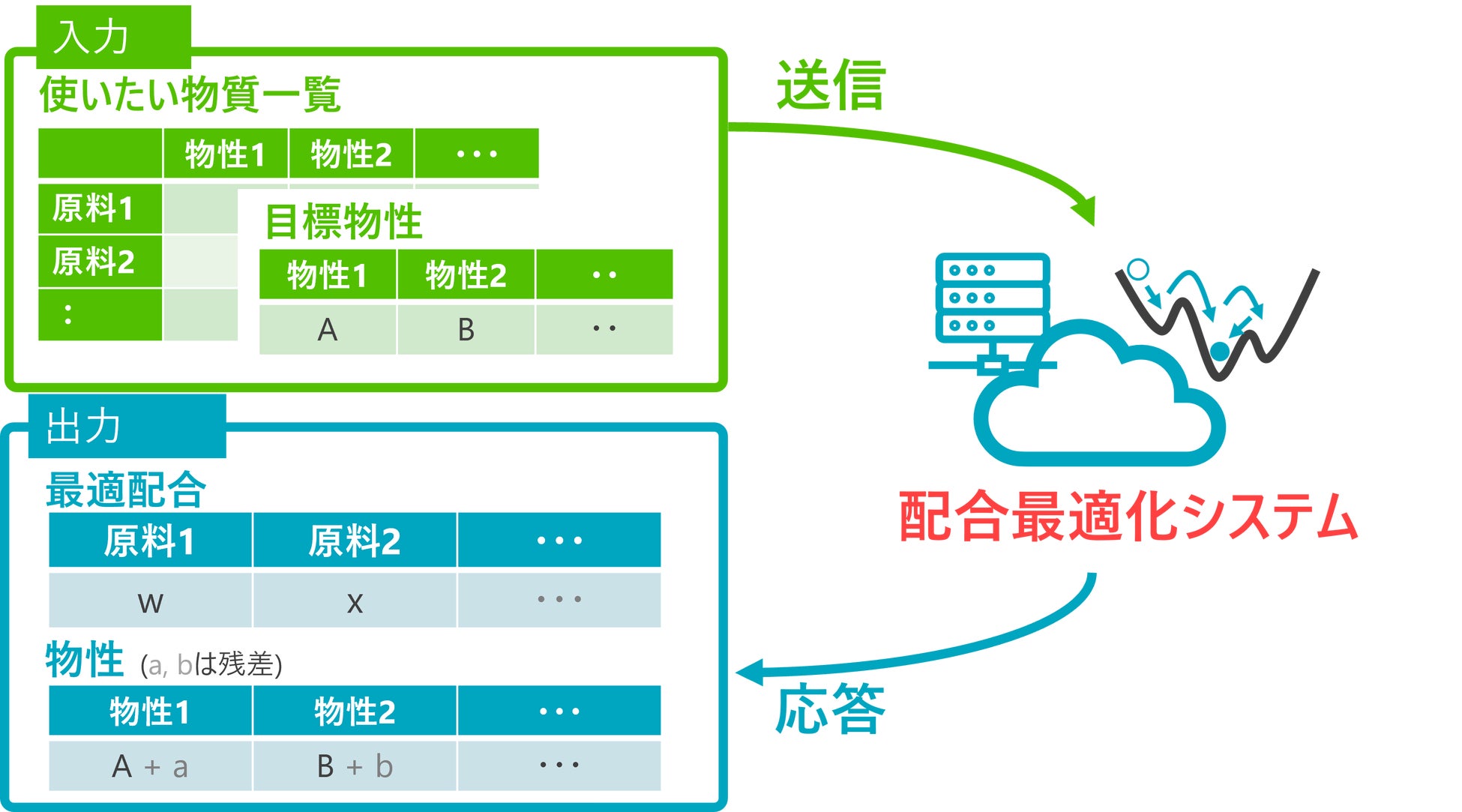 当社は、本技術を活用して、汎用的な配合最適化システムを構築し、社内展開を開始しました。このシステムでは、ユーザーが組成物の目標物性とそれを構成する原料の物性を入力すると、目標物性に近い原料配合比率を得ることができます。