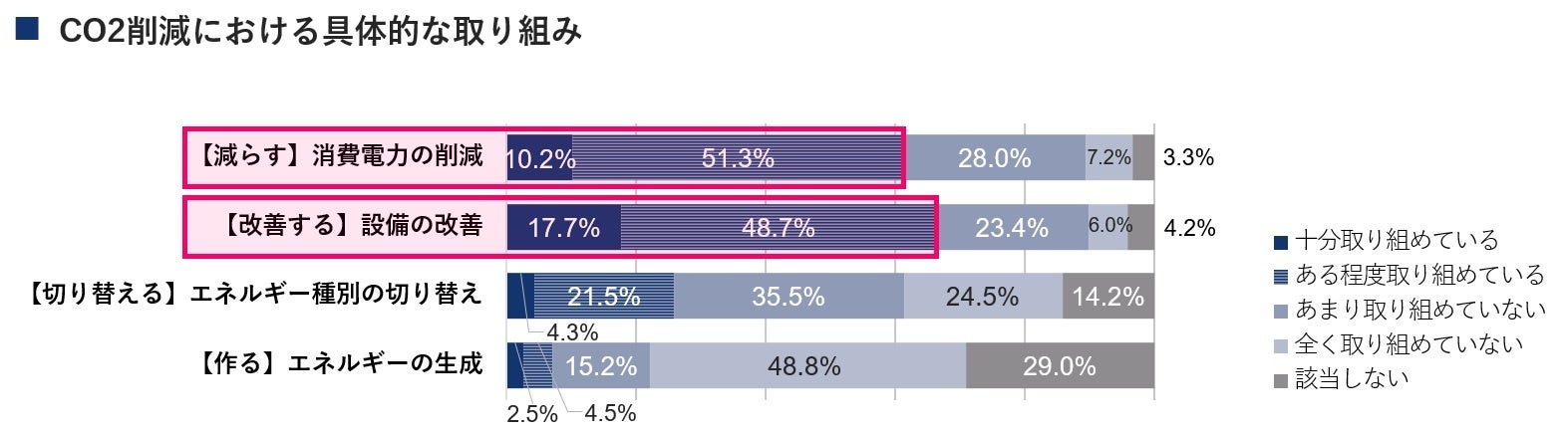 中小企業経営者に、CO2削減の取り組みとしてどういったことを行っているか聞いたところ、エネルギー消費(エネルギー使用量)を削減する【減らす】、設備の改善を行う【改善する】の2つの取り組みをする企業の割合が高く、「十分取り組めている」と「ある程度取り組めている」を合わせると、半分以上が取り組んでいました。取り組む内容が想起しやすく、取り組みやすいことが結果として表れていると考えられます。