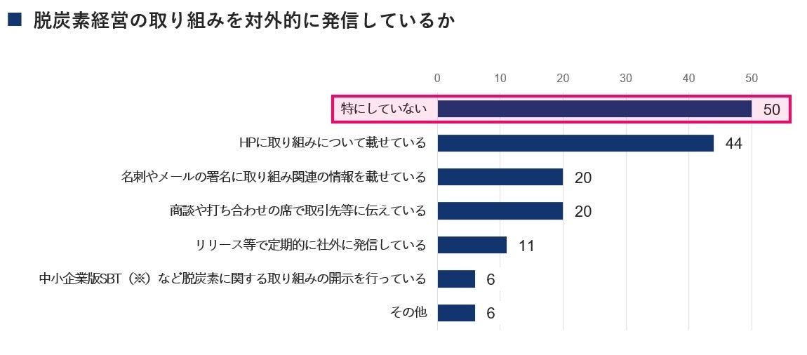 脱炭素経営の取り組みを対外的に発信しているかについては、「特にしていない」が最も多くなりました。脱炭素経営に取り組んでいても、発信しなければステークホルダーに届くことはありません。