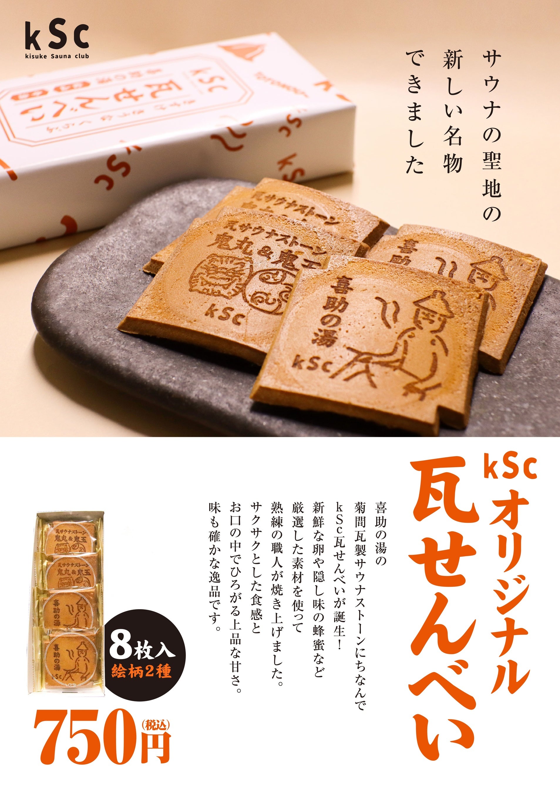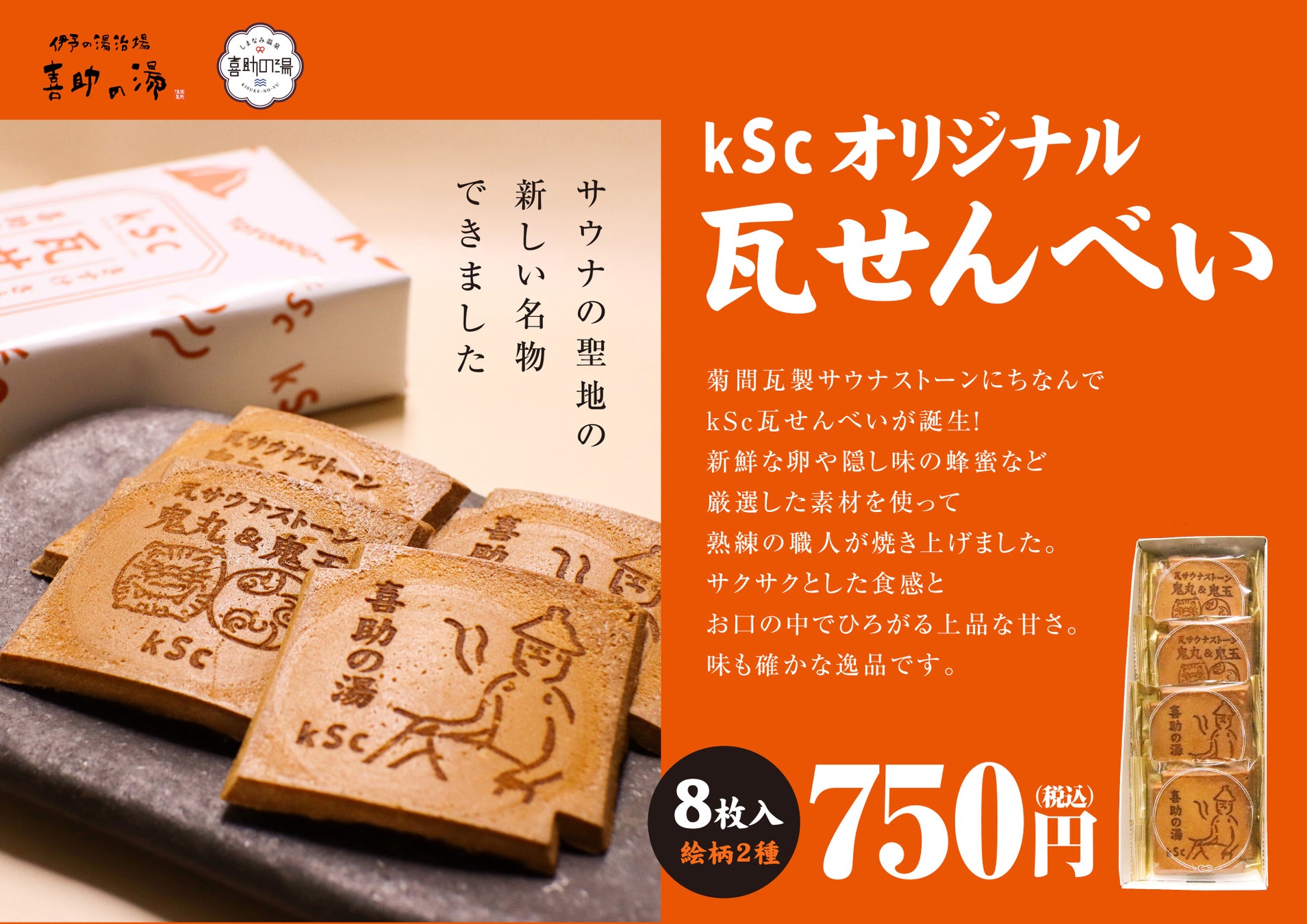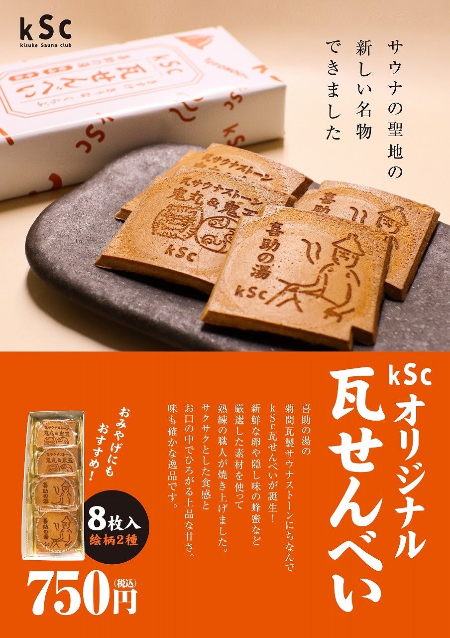 そこでこのサウナランキング日本1位を記念して、「伊予の湯治場 喜助の湯」「しまなみ温泉 喜助の湯」で、新商品「kScオリジナル瓦せんべい」の販売を開始いたします。