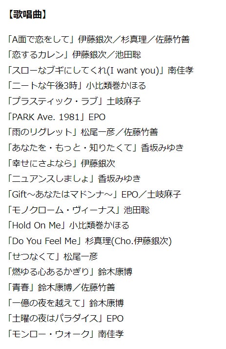 伊藤銀次、杉真理、佐藤竹善がアレンジを加えた「A面で恋をして」、香坂みゆきのヒット曲「ニュアンスしましょ」、EPOによる「土曜の夜はパラダイス」など、「シティポップ・スタジオ」だけのスペシャルバンドによるパフォーマンスが楽しめるほか、作詞家の松本隆を招いて出演者と繰り広げるスペシャルトークコーナーも必見! 当時の思い出や制作秘話など、ここでしか聞けない話が盛りだくさん!