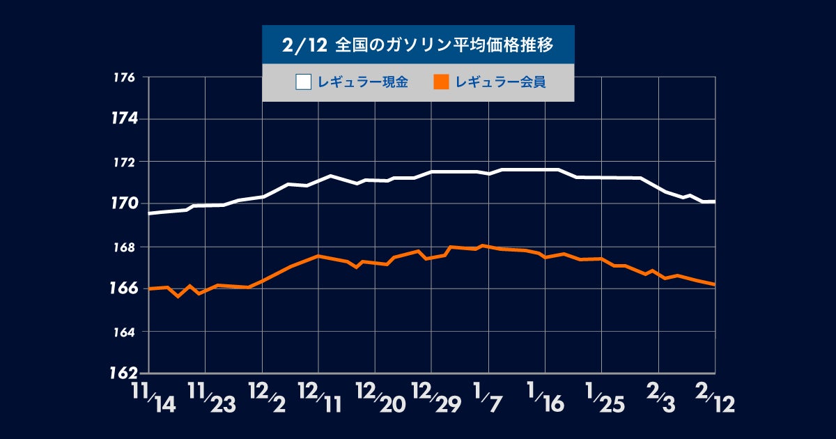 2月12日(月) 時点のレギュラーガソリンの全国平均は、170.1円となり先週から0.5円の値下がり。2週連続の値下がりとなりました。