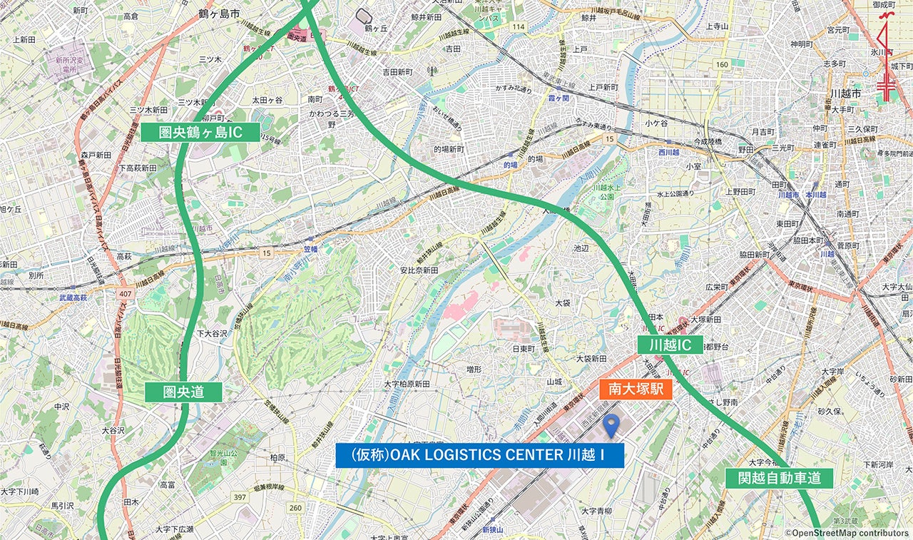 本施設は、関越自動車道「川越インターチェンジ(IC)」から約3.4kmにあり、川越狭山工業団地内に位置しています。首都圏への配送に加え、関越自動車道、圏央道(首都圏中央連絡自動車道)経由での東北自動車道や中央自動車道の利用により、関東全域のみならず広域配送に適した立地です。また、西武新宿線「南大塚駅」より徒歩約11分で通勤できることから、近隣の住宅地だけでなく、鉄道沿線エリアからの労働力確保も期待できる、雇用環境にも優れた立地条件を備えています。