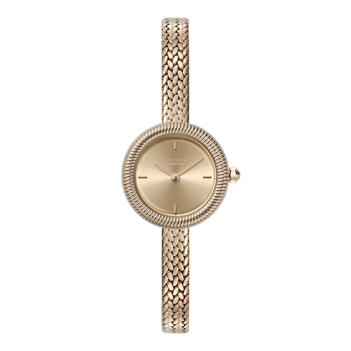 ブランドのアーカイブにあるヴィンテージデザイン、そしてオリビア・バートンのシグネチャーであるグログランリボンからインスピレーションを得た特別なシリーズです。20mmの小ぶりなケースには、繊細な“ツイスト”ディテールを施したテクスチャードベゼルを採用。ダイアルにはトーナルカラーのサンレイ加工を施し、シルバー、ゴールド、ローズゴールドの3種類をご用意。控えめなインデックスと組み合わせ、洗練された手元を演出します。ヴィンテージ感漂うメッシュストラップと組み合わせることで、クラシックとコンテンポラリーが美しく融合したミニウォッチが完成しました。