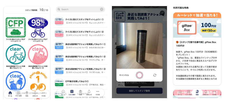 その場で挑戦できるクイズや、日常生活の中で簡単に取り組める脱炭素アクションなど、全10個のミッションを用意しています。さらに、ミッションクリアによって得られたスタンプ数に応じて応募できる景品を段階的に設定することで、継続的に挑戦できる設計としています。