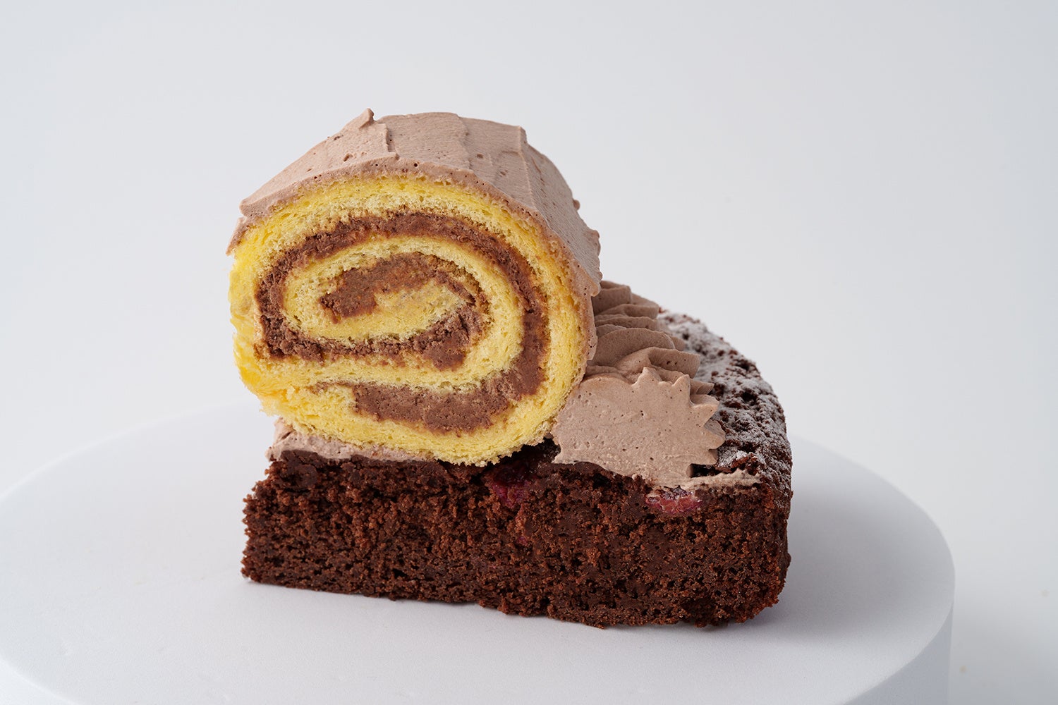 ブッシュドノエル しっとりとした生地にリッチなチョコレートクリームを巻き上げ、さらに香り高いココアソース入りクリームで丁寧に包み込みました。