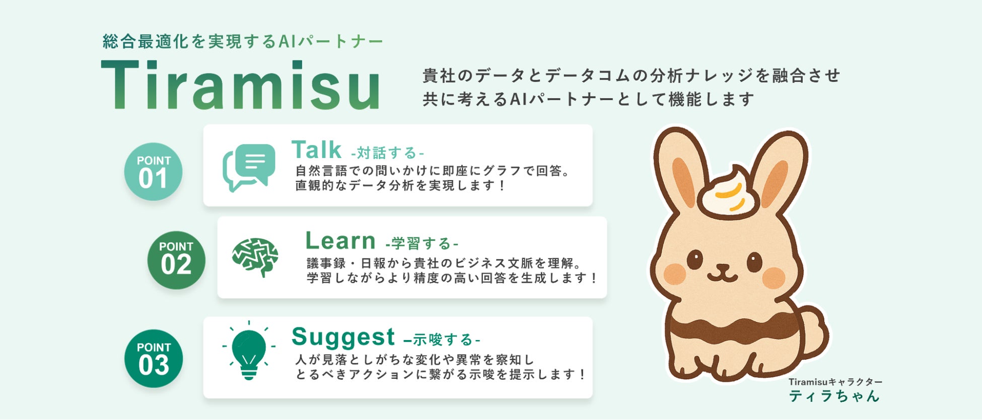 本展示では、当社の強みである分析基盤と30年以上にわたる小売特化のナレッジを活かしたAIソリューション「Tiramisu」をご紹介します。「Talk(対話する)」「Learn(学習する)」「Suggest(示唆する)」の3つのアプローチで、分析から改善提案までを自走します。