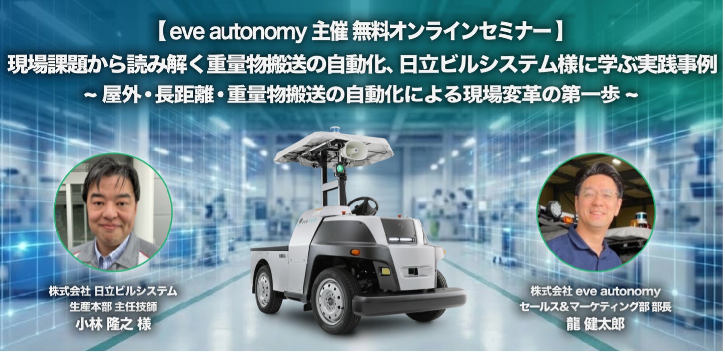 株式会社eve autonomy(イヴ・オートノミー、本社:静岡県磐田市、代表取締役CEO:星野亮介、以下「eve autonomy」)は、株式会社日立ビルシステム 水戸事業所様(以下「日立ビルシステム」)のご担当者をお迎えし、屋外・長距離・重量物搬送の自動化事例をテーマとしたセミナーを、2026年3月25日(水)および3月26日(木)に開催いたします。