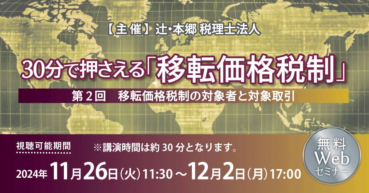 辻・本郷 税理士法人(本社:東京都新宿区、理事長:徳田孝司)は、2024年11月26日(火)より「30分で押さえる『移転価格税制』(第2回)移転価格税制の対象者と対象取引」セミナーを開催いたします。8月に開催した「移転価格税制」のセミナーの第2回目のセミナーです。今回は、基礎編の各論として、移転価格税制の対象となる「国外関連者」と「国外関連取引」について確認し、それらの詳細が記載される法人税申告書別表17(4)について、国税当局がどこに着目しているのか、どのような企業が注意すべきか、ポイントを整理し、解説します。また、グループ連結売上が1,000億円以上となった場合に義務付けられる文書のうち、「最終親会社等届出事項」「国別報告事項(CbCレポート)」についても詳しく説明します。