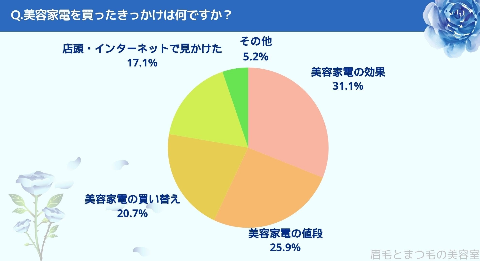 美容家電を買ったきっかけをお聞きしたところ「美容家電の効果(31.1%)」、「美容家電の値段(25.9%)」、「美容家電の買い替え(20.7%)」、「店頭・インターネットで見かけた(17.1%)」、「その他(5.2%)」という結果になりました。