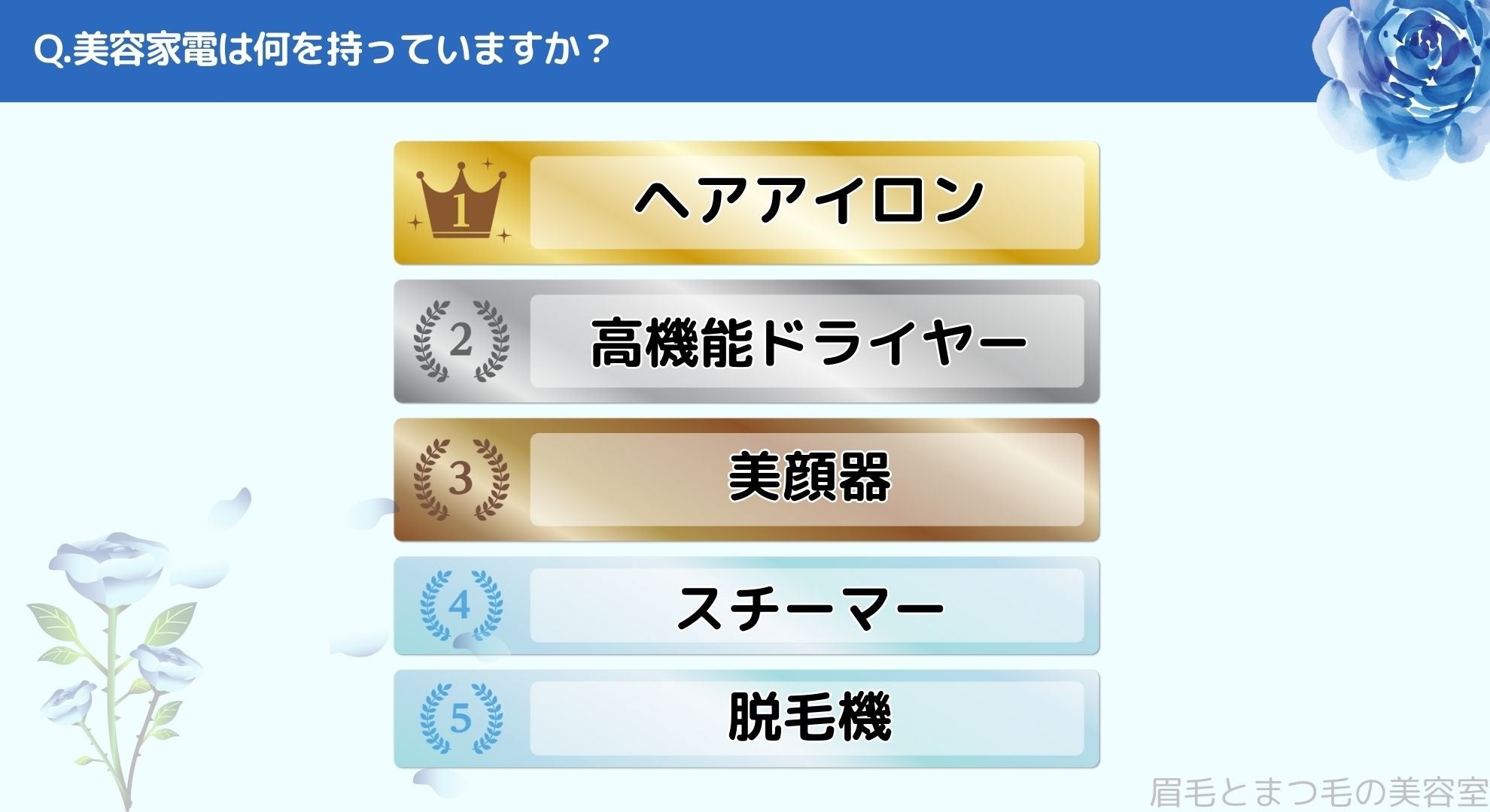 美容家電で何を持っているかお聞きしたところ「1位>ヘアアイロン」、「2位>高機能ドライヤー」、「3位>美顔器」、「4位>スチーマー」、「5位>脱毛機」という結果になりました。